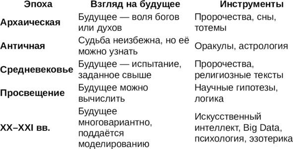 Если мы обратимся к истории, то вспомним, что в Древнем Риме существовала официальная государственная должность — ауспик. Он следил за полётом птиц, чтобы определить, благословляют ли боги военный поход или политическое решение. Без его заключения Сенат не имел права принимать важные решения. Это был не суеверный ритуал, а часть государственного механизма. У ацтеков и майя предсказания были встроены в календарь. Их жрецы вели астрономические наблюдения с точностью, поражающей современных исследователей. По их расчётам определялись благоприятные дни для жертвоприношений, войн, свадеб и посадок. Даже в Древнем Китае при дворе императора работала целая астрологическая служба, задачей которой было предсказывать затмения. Одно пропущенное затмение считалось политическим скандалом и могло стоить советнику жизни. Представьте себе древнего жреца, стоящего на вершине зиккурата под мрачным небом. Ветер несёт пыль и запах грозы. Толпа внизу ждёт ответа: придёт ли дождь? спустятся ли боги? умрёт ли царь? Этот жрец — прообраз и современного аналитика, и таролога, и искусственного интеллекта. Потому что вопрос остался тем же. Собрав воедино разнообразные исторические факты, мы наглядно можем увидеть, как трансформировалось понятие предсказаний по мере развития человечества. В разное время человечество воспринимало будущее по-разному. Мы попытались систематизировать в таблицу для большей наглядности: