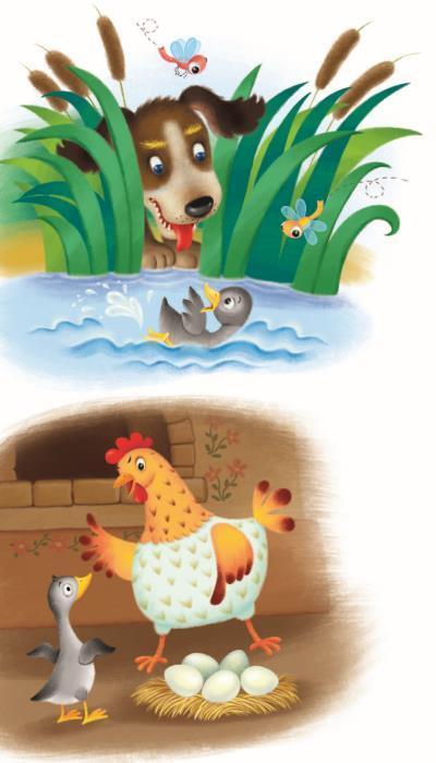На птичьем дворе нескладного утёнка невзлюбили и всё время осыпа`ли насмешками. В конце концов бедняжка не выдержал, перемахнул через изгородь и бежал, пока не очутился в болоте, где жили дикие утки. Два дня провёл он там, держась от них в стороне, а потом явились к нему два диких гусака и предложили стать вольной птицей и летать вместе с ними. Но вдруг прогремели выстрелы, и оба гусака замертво упали в камыши. Бедный утёнок был ни жив ни мёртв от страха. И тут перед ним появилась охотничья собака. Она приблизила к утёнку пасть, оскалила острые зубы и побежала дальше. «Ох, – перевёл дух утёнок. – Я так безобразен, что противен даже собаке!»