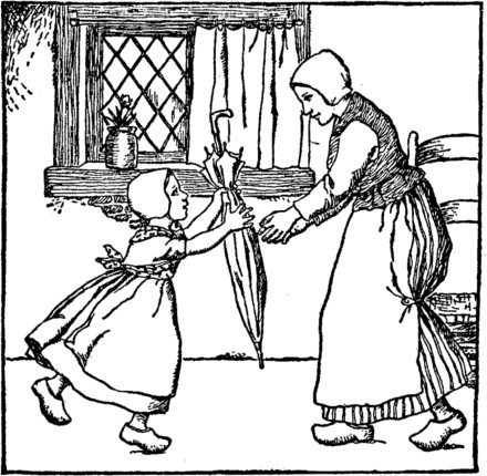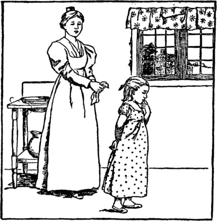 The beet tears melt her back once more Into the child she was before. She does not stay to wipe her eyes, But home with eager feet she hies. "Oh mother, mother dear," cries she, "Henceforth a cleaner child I'll be."