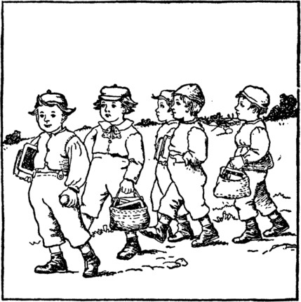 These small boys started off for school But loitered by the way, Until at last 'twas quite too late To go to school that day. Ah naughty, naughty, truant boys! But listen what befell! Close by a wicked ogress lived, Down in a lonesome dell.