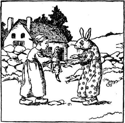 "Now," cry the rabbits, "we will play, For these girls cannot run away." But while they rock their dolls and sing The witch brings home her marketing. "Where are you children dear," she cries. The little rabbit boy replies;—