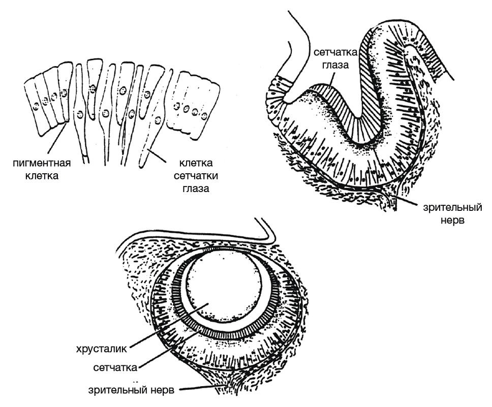Глазной ряд. Слева: Небольшой участок фоторецепторов медуз. Справа: Глаз морских моллюсков с хрусталиком. Внизу: Глаз морской улитки с хрусталиком