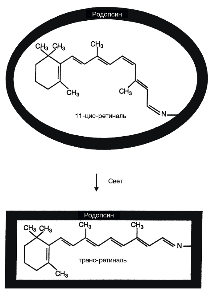9. Согласно общепринятым научным понятиям ретиналь не связан с родопсином, а является его частью. Данная формулировка была бы более корректной: «Изменение формы молекулы ретиналя приводит к изменению формы белка родопсина, в состав которого входит ретиналь». — Прим. науч. ред.