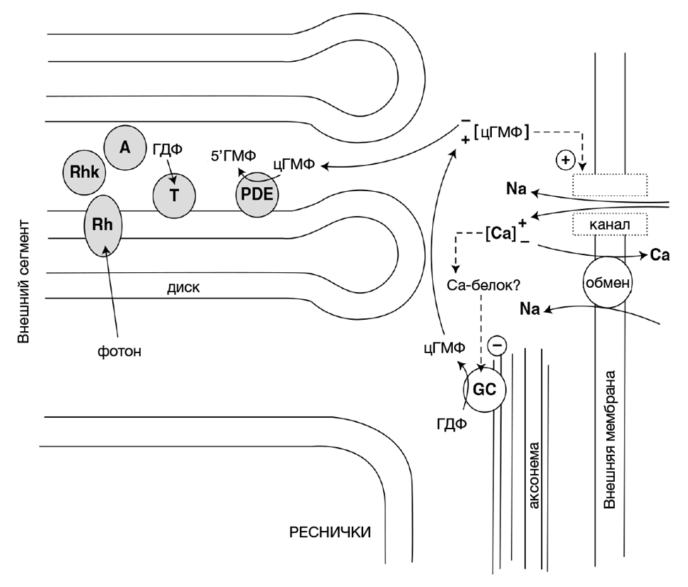 Биохимия зрения. Rh — родопсин, RhK — родопсинкиназа, A — аррестин, GC — гуанилатциклаза, T — трансдуцин, PDE — фосфодиэстераза