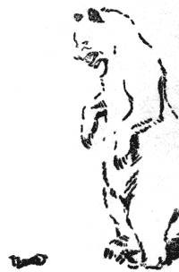 The monotony of his life was occasionally varied with a dog fight. His tormentors would bring their Bear dogs "to try them on the cub." It seemed to be very pleasant sport to men and dogs, till Jack learned how to receive them. At first he used to rush furiously at the nearest tormentor until brought up with a jerk at the end of his chain and completely exposed to attack behind from another dog. A month or two entirely changed his method. He learned to sit against the hogshead and quietly watch the noisy dogs around him, with much show of inattention, making no move, no matter how near they were, until they "bunched," that is, gathered in one place. Then he charged. It was inevitable that the hind dogs would be the last to jump, and so hindered the front ones; thus Jack would "get" one or more of them, and the game became unpopular.