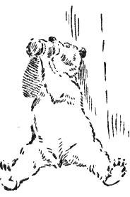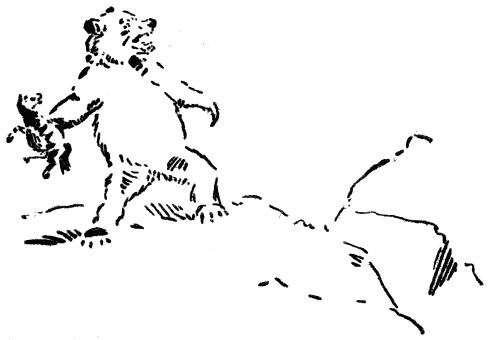 One hot day, while the two men smoked in front of Kellyan's house, the dog chased Jack up a tree and then stretched himself out for a pleasant nap in the shade of its branches. Jack was forgotten as the dog slumbered. The little Bear kept very quiet for a while, then, as his twinkling brown eyes came back to that hateful dog, that he could neither catch nor get away from, an idea seemed to grow in his small brain. He began to move slowly and silently down the branch until he was over the foe, slumbering, twitching his limbs, and making little sounds that told of dreams of the chase, or, more likely, dreams of tormenting a helpless Bear cub. Of course, Jack knew nothing of that. His one thought, doubtless, was that he hated that cur and now he could vent his hate. He came just over the tyrant, and taking careful aim, he jumped and landed squarely on the dog's ribs. It was a terribly rude awakening, but the dog gave no yelp, for the good reason that the breath was knocked out of his body. No bones were broken, though he was barely able to drag himself away in silent defeat, while Jacky played a lively tune on his rear with paws that were fringed with meat-hooks.