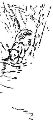 The little Bear, fortunately for himself, went slowly, since in doubt; he made no sudden move, and he waited a long time, though urged to go on, till the whole swarm of bees had reentered their nest. Now Jacky jerked his nose up, hitched softly out a little farther till right over the fateful paper globe. He reached out, and by lucky chance put one horny little paw-pad over the hole; his other arm grasped the nest, and leaping from the branch he plunged headlong into the pool below, taking the whole thing with him. As soon as he reached the water his hind feet were seen tearing into the nest, kicking it to pieces; then he let it go and struck out for the shore, the nest floating in rags down-stream. He ran alongside till the comb lodged against a shallow place, then he plunged in again; the wasps were drowned or too wet to be dangerous, and he carried his prize to the bank in triumph. No honey; of course, that was a disappointment, but there were lots of fat white grubs—almost as good—and Jack ate till his paunch looked like a little rubber balloon.