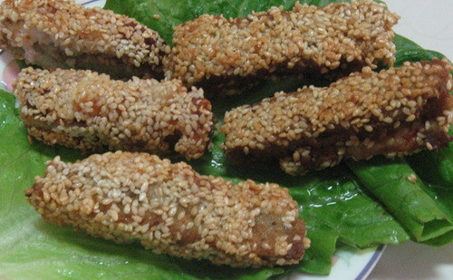 3. Sprinkle sesame seeds over the surface gently pressing them so that they stick to the scampi mixture; Brush the undersides of the bread with egg yolk.