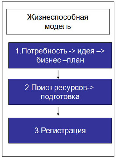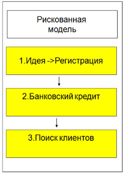 Первая — рискованная модель, которая распространена среди отечественных предпринимателей при запуске своего бизнеса. В этой модели предприниматель интуитивно выбирает бизнес-идею, ему кажется, что она должна работать. Он регистрируется в налоговых органах. Затем с трудом получает кредит в банке, используя чаще всего купленный бизнес-план, который не имеет ничего общего с его планами. И только получив денежные средства и закупив товары, будущий бизнесмен начинает искать своих потребителей.