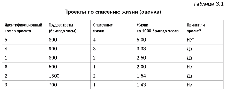 Определение оптимальной цены. Для того чтобы понять, как решить эту проблему, обратимся к еще более простому случаю. Предположим, вы заранее знали, какие проекты будут предложены в течение года. Для того чтобы максимизировать число спасенных жизней, при условии ограниченного фонда рабочего времени, вы могли бы начать с реализации тех проектов, которые имеют самый высокий показатель отдачи на единицу затрачиваемого ресурса, а затем переходить от проектов с самым высоким показателем отдачи к проектам с более низкими значениями показателя до тех пор, пока фонд рабочего времени не будет полностью исчерпан. Иначе говоря, перевод рабочей силы с проекта, который позволяет спасти меньшее число жизней (в расчете на час работы бригады), на другой, с бóльшим числом спасаемых, увеличил бы численность спасенных жизней без каких-либо дополнительных затрат рабочего времени. Таким образом, вы могли бы ранжировать проекты по числу спасенных жизней на 1000 часов работы бригады. Этот показатель эффективности рабочего времени в единицах спасения жизней для проектов прошлого года приведен в табл. 3.1.