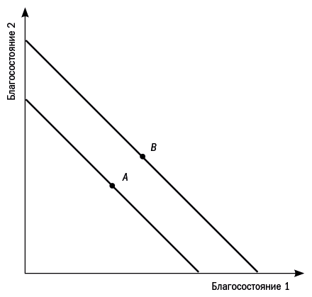 18. Чтобы установить, как три предыдущих условия соотносятся с этой формулой, отметим вначале, что изменение х, необходимое для того, чтобы компенсировать любой переход от у1 к у2, легко вычисляется по формуле Δх = v(y2) — v(y1), поскольку для любого данного первоначального уровня благосостояния, М, М + Δх + v(y2) = М + v(y1). Тогда изменение х, компенсирующее переход от у1 к у2, равно х. Вычисленная величина х не зависит от первоначального благосостояния М, как требует второе условие. Для обычной функции полезности u(х, у) не может существовать ни одна величина Δ, при которой было бы верным равенство u(М + Δ, y2) = u(M, y1), как требует первое условие, и даже если бы такая величина и существовала, ее значение, как правило, зависело бы от М. Наконец, пока первоначальное благосостояние М больше, чем максимально возможная разность между значениями v(y) для двух различных значений y, трансферт Δх не может потребовать уплаты большей денежной суммы, чем та, которой располагает данное лицо; следовательно, выполняется третье условие.