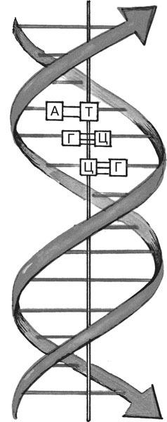 Представьте себе две цепочки или лучше – два стержня, каждый из которых состоит из чередующихся остатков сахара (рибозы) и фосфорной кислоты. Заверните эти стержни спиралью и соедините стержни поперечинами. Получится эдакая закрученная лестница. Поперечины, ступеньки лестницы, состоят каждая из двух азотистых оснований. Всего этих оснований четыре: аденин (А), тимин (Т), гуанин (Г) и цитозин (Ц). Каждая ступенька состоит или из гуанина и цитозина, или из аденина и тимина. Составить ступеньку, скажем, из цитозина и тимина не удастся, в этом случае она просто «не влезет» в пространство между стержнями. Ступеньки присоединяются всегда к противолежащим остаткам сахара. Благодаря тому, что остатки сахара чередуются с остатками фосфорной кислоты, между ступеньками и образуются промежутки. Каждая ступенька может быть присоединена к стержню как тиминовым (гуаниновым) концом, так и противоположным – адениновым (цитозиновым). Вот и все разнообразие: по сравнению с белком кажется негусто.