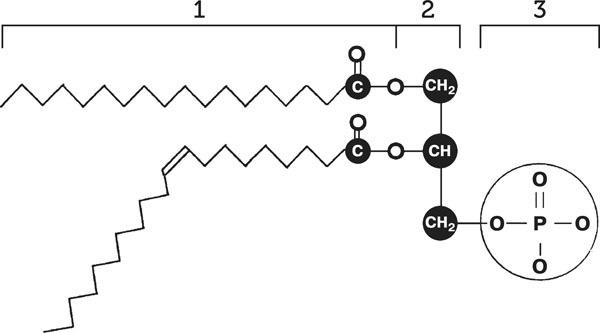 Формула молекулы фосфолипида: 1 – остаток жирной кислоты; 2 – остаток глицерина; 3 – остаток фосфорной кислоты