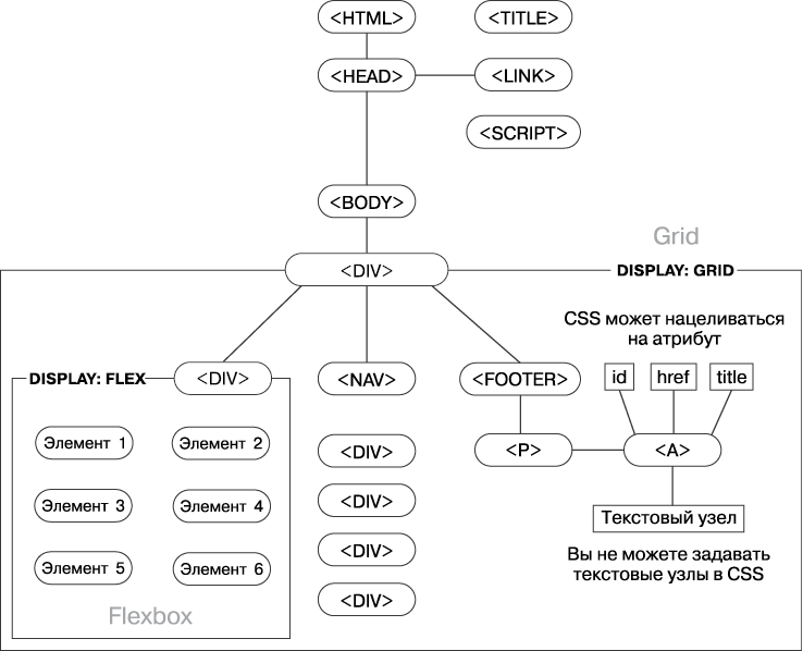 Посмотрите на следующую схему. Стили CSS буквально «сползают» по иерархии DOM, представляющей древовидную структуру вашего сайта. Язык CSS (с помощью некоторых селекторов) позволяет контролировать этот обычно странный процесс.