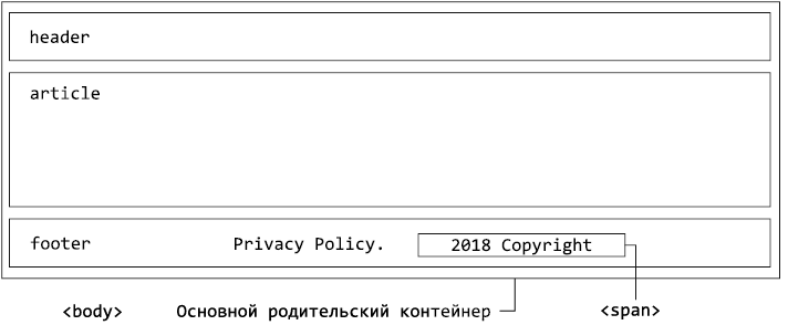 Обратите внимание: между словами footer и span есть пробел. В CSS он выступает актуальным символом селектора CSS. Это означает следующее: «найти в ранее указанном теге» (в данном примере footer).
