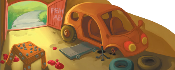 Его дразнили в собственной мастерской! Никакого уважения! Кубик огляделся. Рядом стоял полуразобранный жукамобиль – лёгкое мобильное средство передвижения на четырёх колёсах, похожее на шустрого приплюснутого таракана. Как раз сейчас Кубик его ремонтировал. Густо пахло резиной, машинным маслом и малиновым вареньем. Солнечный свет тёплой лужей разливался от распахнутых ворот.