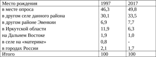 В результате миграций в настоящее время половина взрослых эвенков проживает не в месте своего рождения (табл. 2).