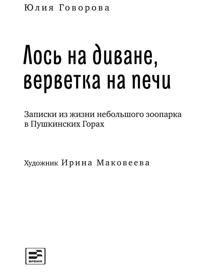 Лось на диване, верветка на печи. Записки из жизни небольшого зоопарка в Пушкинских Горах / Юлия Геннадьевна Говорова. — М. : Время, 2020. — (Время — юность!).