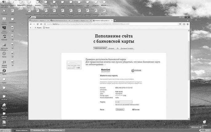 После этого внизу жмете на панель «Пополнить счет», и на ваш сотовый телефон приходит sms-сообщение обычно с шестизначным паролем, который вы вводите для того, чтобы подтвердить и закончить оплату (рис. 5).