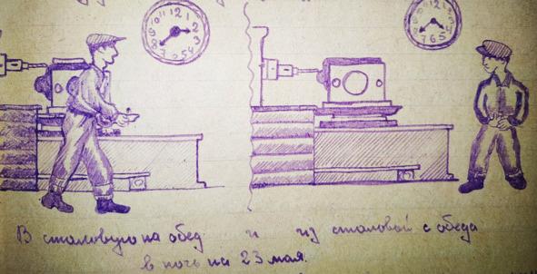 Домой приехал полчаса девятого. Володя был уже дома. Пошамал суп и одну котлетку, мама вчера не стала есть. Володя говорит, что картошку вчера мама сажать не стала из-за дождя. После еды Володя лёг спать, я вымыл ноги. Лёг спать в 11:00. Спал плохо, встал полчаса шестого, умылся. Пока спал, погода изменилась, шел дождик и сейчас солнышка нет. Вчера мама купила в моём магазине 100 г конфет. Мама пришла около шести. Из столовой принесла суп лапшу и лапшу с печёнкой. На остановку пошёл в 18:40, долго ждал трамвай. На УЗТМ приехал в 19:40. Работа пошла с десяти. Шихман читал мне нотацию, дескать мало делаю, надо делать больше. Говорит: «сегодня сделай восемь казенников, я утром проверю». Пришлось поднажимать. К обеду сделал три казенника. В столовой ел суп ячневый, кашу ячневую с маслом, селёдку с ячневой кашей и 200г коммерческого хлеба (100 г мяса и 40 г крупы и 10 г жиров) на 2 руб 65 коп. Из столовой пришёл в 2:45 и сразу же стал работать. Жал здорово. Закончил 7:00. Сделал шесть казенников: 2697—1; 3024—2; 2875—2; 2873—2; 2709—1; 2940—1. Вычистил станок, поставил казенник, и в 7:40 пошёл домой.