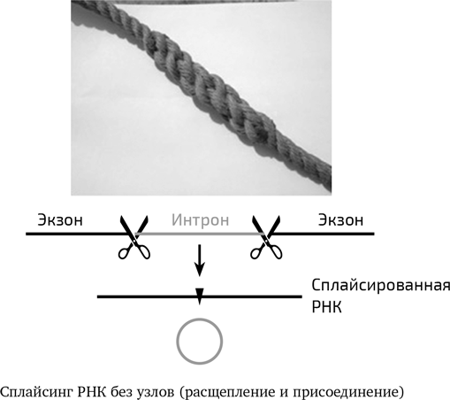 Во время плавания по Балтийскому морю на трехмачтовом круизном судне «Лили Марлен» однажды утром меня удивил один матрос, сделав подарок: сращенную веревку. Он соединил две веревки, срастив их концы (в биологии используется слово «сплайсинг»), — получилось наглядное пособие для студентов, которым я читаю лекции по вирусологии. По словам матроса, для сращивания требуются определенные навыки, но это занятие скрашивало утомительные ночные вахты. В книге «Сплесень и узлы» описывается, как это используется в мореходстве. Хорошо было бы иметь книгу с таким же названием в молекулярной биологии. Сращивание — это своего рода противоположность узлу. Только когда концы веревки правильно сращены, моряк может быстро и беспрепятственно проверить все связанные части, протянуть веревки через шкивы и поднять паруса; при наличии узлов этого не удалось бы сделать. Такой же принцип работает и для молекулярного мира. Двухцепочечная ДНК транскрибируется в одноцепочечную РНК — гибкую копию ДНК, имеющую жесткую структуру. РНК можно укорачивать, как веревку, путем сплайсинга: веревка разрезается, какой-нибудь кусочек удаляется, а полученные концы соединяются без использования узлов путем сращивания. Длина удаленных кусочков может быть разной. А сейчас я открою один секрет: у человека самое большое число таких удаляемых участков из расчета на один ген. Именно поэтому мы самые сложноорганизованные живые существа. В этом заключается наша уникальность; возможно, мы действительно являемся «венцом творения».