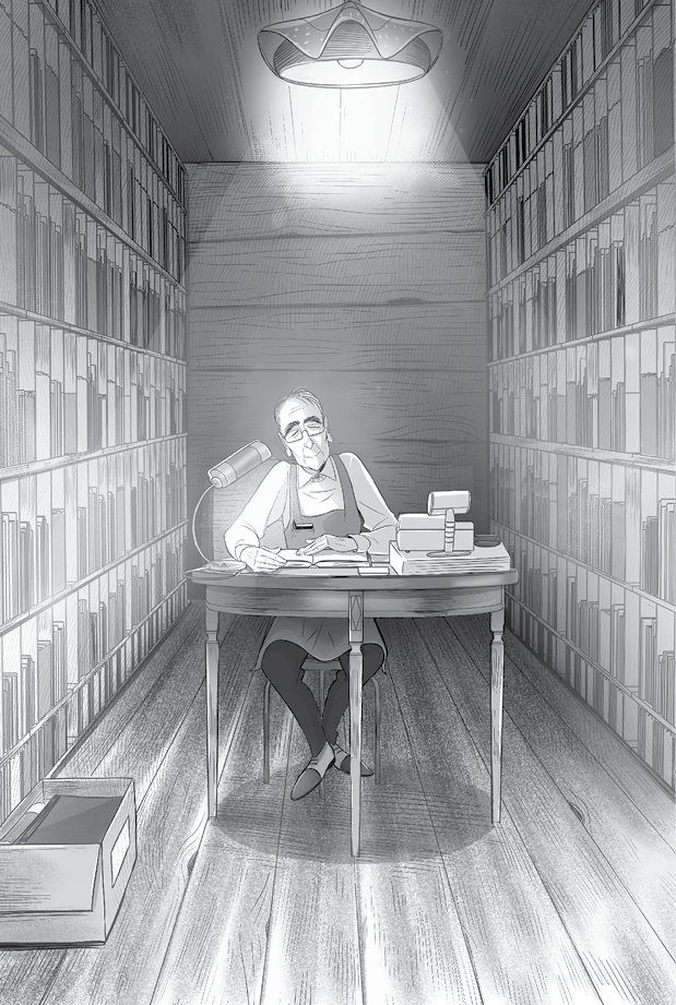 В одном из переулков в старой части города затерялся крошечный магазинчик «Книжная лавка Нацуки». У него довольно своеобразная планировка: сразу от входа и до задней стены тянется узкий проход, по обе его стороны, от пола до потолка, громоздятся книжные стеллажи, словно возвышаясь над проходом. С потолка свисает старинная лампа, ее мягкий свет отражается от полированного пола. В центре прохода — небольшой столик с кассой для расчетов с покупателями и круглая табуретка, другой мебели нет. В конце прохода — тупик, стена из гипсокартона, обитая досками, но посетителю, входящему в лавку с освещенной солнцем улицы, может показаться, что темный проход, стиснутый книжными стеллажами, уходит в черную бесконечность. Облик деда, читающего книгу за столиком посередине прохода, напоминает изысканный европейский портрет маслом. Страницы открытой книги освещает маленькая настольная лампа. Фигура деда окутана смутной тенью. Таким запомнил его Ринтаро.