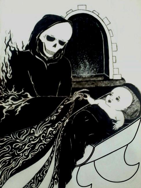 Младенец распахнул глаза и удивлённо, не ужаснувшись, воззрился на Мрачного Жнеца. Он был заинтересован, потому что не знал, кто перед ним. Но и не радовался новому знакомству из-за беспокойства, опутавшего юную невинную душу подобно тенётам. Мальчик открыл рот и сразу закрыл, не в силах закричать. Часто-часто беззвучно дыша, он заглянул в пустые глазницы черепа, ища отклика.