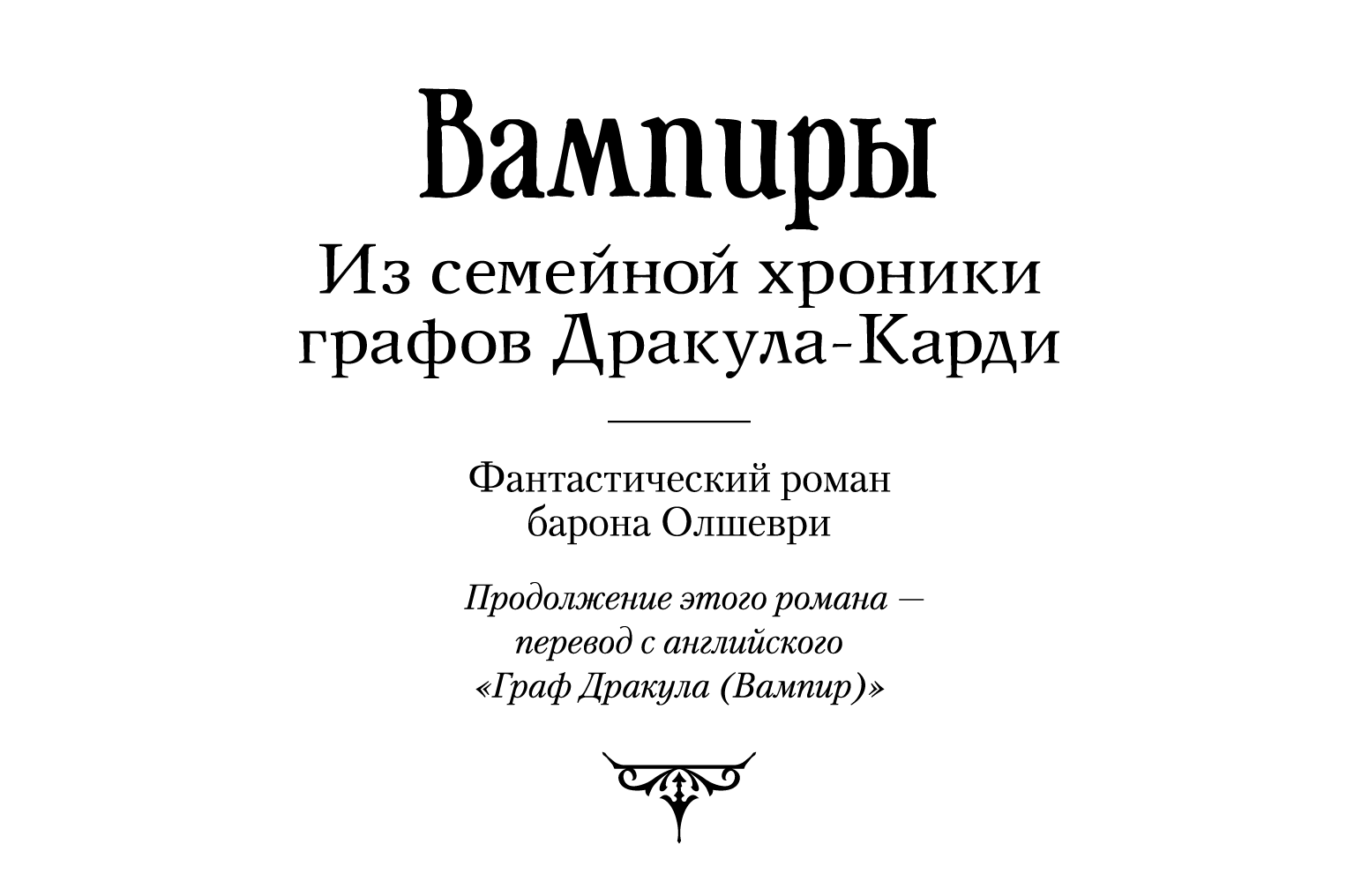 Между прочим, на титульном листе издания 1912 года было указано, что вторичен именно роман Стокера, переведенный с английского: он-де является продолжением «Вампиров» барона Олшеври. Конечно же, данное заявление (вероятно, нацеленное на привлечение покупателей) вызывает улыбку, однако оно приводится и в предлагаемой книге, являясь элементом литературной игры и неотъемлемой частью литературного памятника, коим, бесспорно, являются «Вампиры».