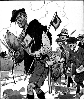 "With me as your leader, your guide, your mentor, we shall go forth into the open, to seek out the bosky dell; to pierce the wildwood tangle; to penetrate the trackless wilderness. Our tents shall be spread alongside the purling brook, hard by some larger body of water. There, in my mind's eye, I see us as we practise archery and the use of the singlestick, both noble sports and much favoured by the early Britons. There we cull the flowers of the field and the forest glade, weaving them into garlands, building them into nosegays. By kindness and patience we tame the wild creatures. We learn to know the calls of the wildwood warblers, which I am credibly informed are many and varied in character; and by imitating those calls we charm the feathered minstrels to leave their accustomed haunts on the sheltering bough and to come and perch on our outstretched hands.