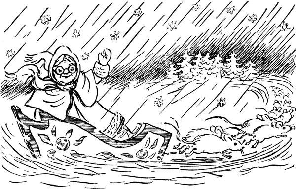 И вдруг дети увидели впереди себя мчащиеся вихрем саночки. Их везла вереница белых мышей, а в саночках сидела и, обернувшись, махала детям рукой старушка в заснеженной шубе и в большом заснеженном платке.