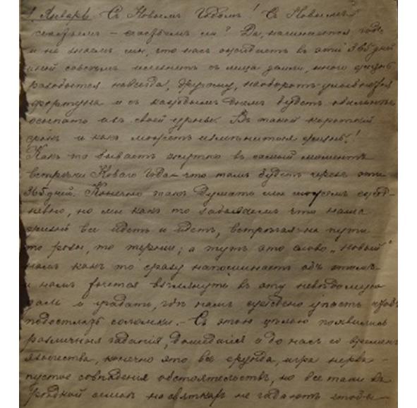 16-го, въ мои именины погода была дивная, на мое счастье. Была среда, и мы были у обедни. … Часу во второмъ прiехала Нюша съ Лелей. После завтрака мы занялись съ ней чтенiемъ полученныхъ мною летнихъ писемъ. … уселись въ тетку, а потомъ гиганскiе. Уставши, отправились въ зало и слушали игру Л. Д. и Капочки въ 4 руки. Въ довершенiе, Нюша спела кой-что изъ своего репертуара, такъ и прошло время до ужина. После чая все… прошлись по морю. Ужъ было почти темно, т.ч. брали фонари. Вернулись домой около 1 часу, но уснули нескоро, устраивая другъ другу разныя каверзы.