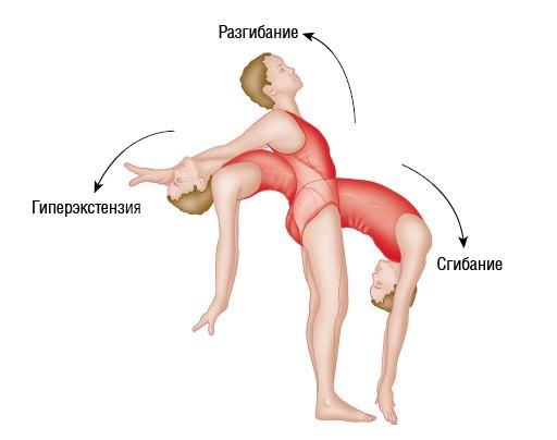 Рисунок 1.18. Сгибание — движение, в ходе которого угол между костями сустава уменьшается. Во время сгибания движение тела или конечности обычно направлено вперед (кроме коленного сустава). Чтобы запомнить это, нужно усвоить, что сгибание приводит к принятию позы эмбриона. Разгибание — движение, в ходе которого угол между костями сустава увеличивается, происходит выпрямление. Во время разгибания движение тела или конечности обычно направлено назад (кроме коленного сустава). Чтобы запомнить это, нужно усвоить, что разгибание приводит к выходу из позы эмбриона. Гиперэкстензия — движение, в ходе которого конечность разгибается за пределы нормального диапазона движения сустава