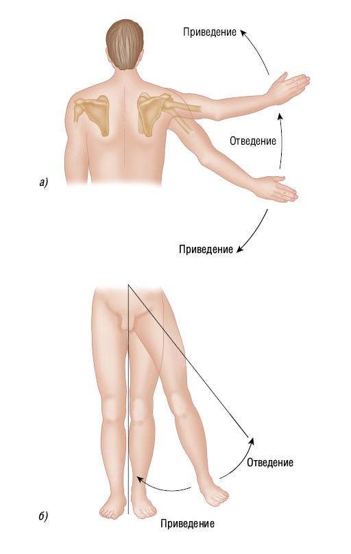 Рисунок 1.20. Отведение — движение кости от срединной линии тела. Приведение — движение кости к срединной линии тела. Исключение составляют только пальцы кистей и стоп, где приведение и отведение пальцев совершаются по направлению к продольной срединной линии верхней или нижней конечности и от нее соответственно