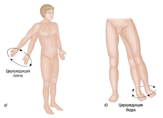 Рисунок 1.24. Циркумдукция — круговое движение, при котором дистальный конец кости (в данном случае плечевой и бедренной) движется по кругу, а проксимальный конец остается неподвижным. Часто является сочетанием сгибания, отведения, разгибания и приведения