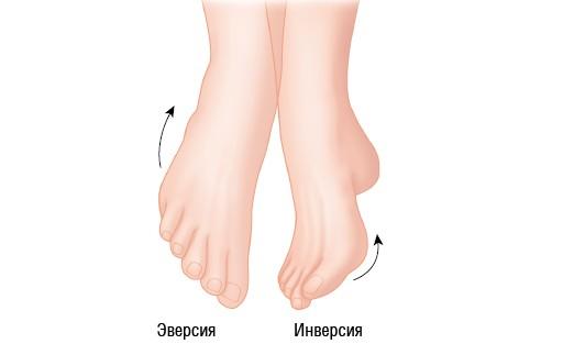 Рисунок 1.26. Инверсия — подъем внутреннего края стопы в тыльном направлении. В результате ступни оказываются обращенными друг к другу. Эверсия — поворот внутреннего края стопы в подошвенном направлении. В результате стопы оказываются обращенными тыльными сторонами друг к другу