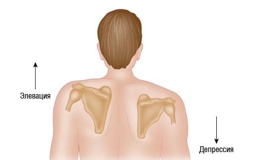 Рисунок 1.29. Элевация — движение части тела вверх во фронтальной плоскости, например элевация лопатки при подъеме плеча. Депрессия — движение поднятой части тела вниз с возвращением в исходное положение, например депрессия лопатки