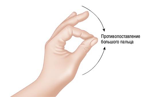 Рисунок 1.30. Противопоставление большого пальца — движение, характерное для седловидного сустава, который позволяет прикоснуться большим пальцем к кончикам других пальцев той же руки