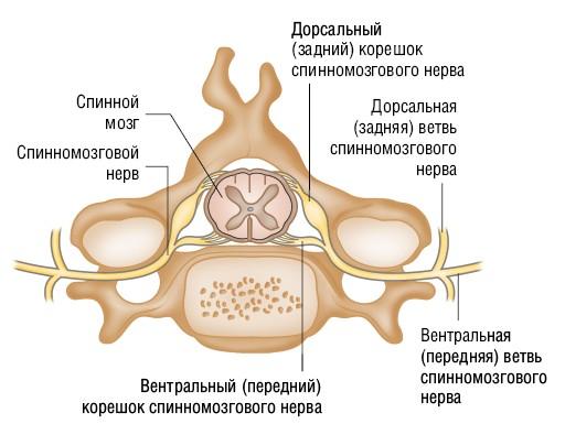 2 Сегмент позвоночника — это часть спинного мозга, дающая начало каждой паре спинномозговых нервов (по одному с каждой стороны тела). Каждый спинномозговой нерв содержит чувствительные (сенсорные) и двигательные волокна, отходящие от дорсального и вентрального корешков соответственно. Вскоре после выхода из канала или прохода между позвонками спинномозговой нерв делится на дорсальную ветвь, направленную назад, и вентральную ветвь, направленную вперед и латерально (в сторону). Волокна ветвей иннервируют кожу и мышцы — разгибатели шеи и туловища. Вентральные ветви иннервируют конечности, а также переднюю и боковые части туловища.