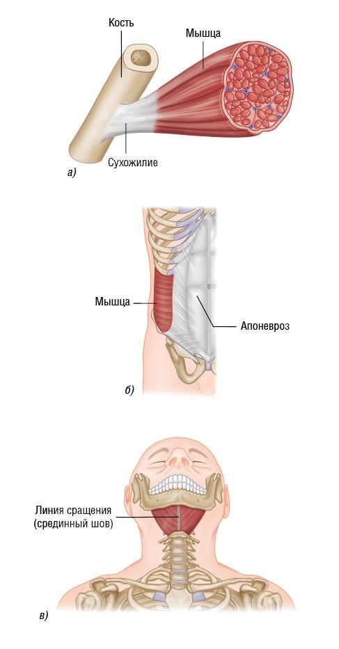 Сухожилие представляет собой высокопрочную плотную соединительную ткань, выходящую за пределы конца мышцы в виде подобия круглых шнуров или плоских полос. Апоневроз — это слой плотных коллагеновых и эластических волокон, выходящих за пределы конца мышцы в виде тонкой, широкой и плоской пластины.