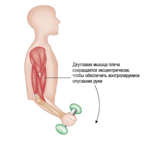 Рисунок 2.4. Эксцентрическое изотоническое сокращение. Двуглавая мышца плеча сокращается эксцентрически, чтобы опустить гантель в сторону