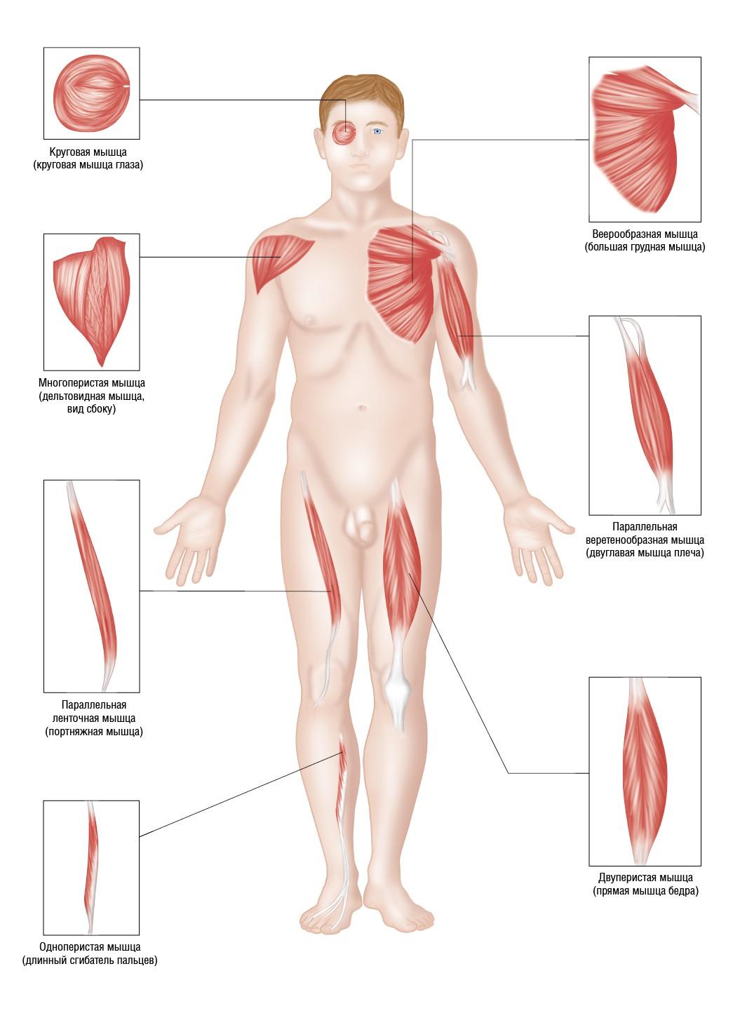 Благодаря определенному направлению волокон достигается оптимальная механическая эффективность мышцы с учетом ее положения и действия. Наиболее распространенными являются параллельные, косые (одноперистые, двуперистые, многоперистые), веерообразные и круговые мышцы, причем каждая из них тоже делится на соответствующие категории (см. рис. 2.5).