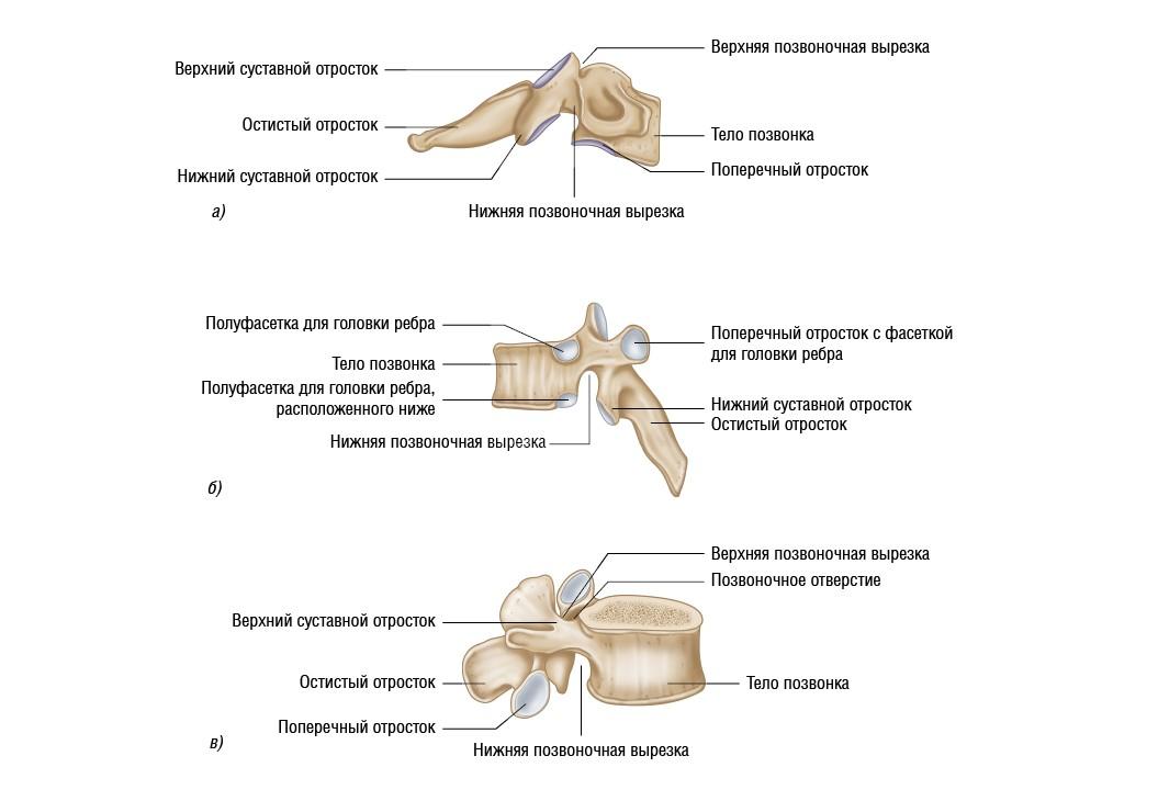 Рисунок 2.11. Типы позвонков: а) шейный; б) грудной; в) поясничный. Вид сбоку