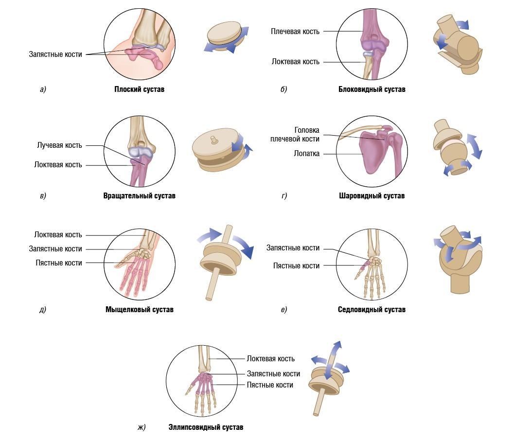 Различают семь типов синовиальных суставов: плоский (скользящий), блоковидный цилиндрический (шарнирный), вращательный цилиндрический, шаровидный, мыщелковый, седловидный и эллипсовидный.