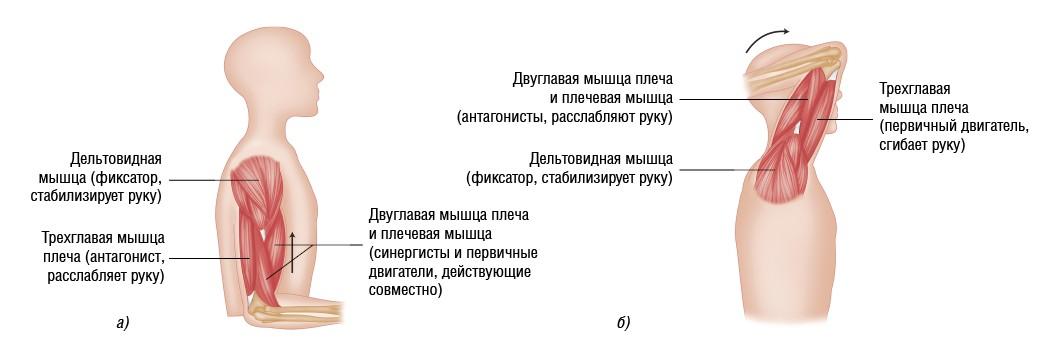 Рисунок 2.20. Групповое действие мышц: а) сгибание руки в локтевом суставе; б) разгибание руки в локтевом суставе (смена ролей первичного двигателя и антагониста)
