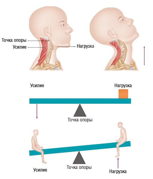 Рисунок 2.22. Рычаг первого рода. Взаимное расположение компонентов: нагрузка — точка опоры — усилие. Примерами могут служить качели и ножницы. Применительно к телу человека подобным примером является способность разгибать голову и шею: здесь нагрузкой являются лицевые структуры, точкой опоры — атлантозатылочный сустав, а усилие обеспечивают мышцы задней части шеи
