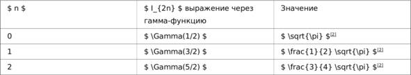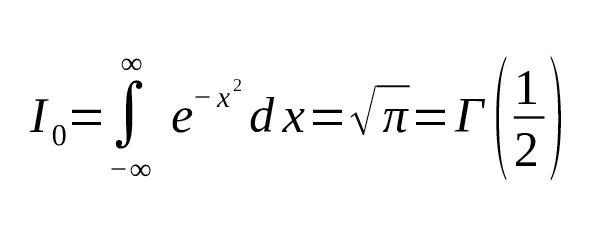 Это показывает прямую связь между чётными степенями интеграла Гаусса и значениями гамма-функции, и объясняет, почему значения при полуцелых аргументах выражаются через $ \sqrt {\pi} $ [1] [2].