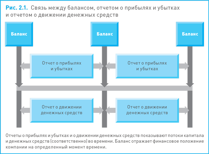 Это различие иллюстрирует рис. 2.1. Комплект форм отчетности — отчет о прибылях и убытках, отчет о движении денежных средств и баланс — нередко называют итоговой отчетностью.