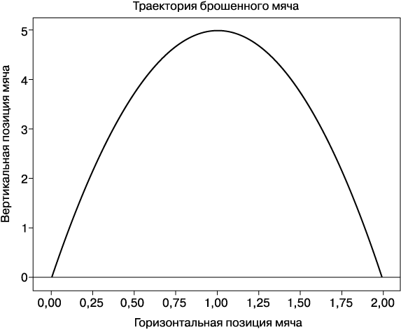 На выходе (рис. 1.1) вы получаете красивый график с той траекторией, по которой наш гипотетический мяч должен перемещаться в пространстве. Красивая криволинейная траектория будет похожей для всех движущихся брошенных тел, находящихся под воздействием силы тяготения; писатель Томас Пинчон (Thomas Pynchon) поэтично назвал ее радугой тяготения.