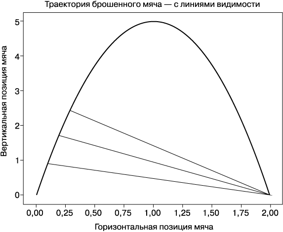 Рис. 1.2. Траектория гипотетического брошенного мяча с отрезками, представляющими линии видимости мяча