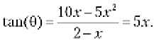 Тангенс вычисляется отношением длины стороны A к длине стороны B. Высота A вычисляется по формуле 10x – 5x2, а длина B — по формуле 2 – x. Таким образом, следующее уравнение неявно описывает угол θ для каждой точки полета: